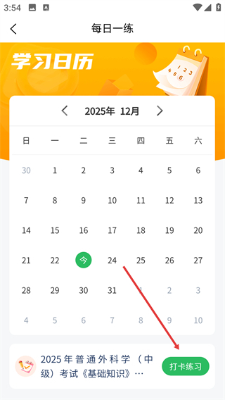 进入【每日一练】板块后,在【学习日历】页面找到并选择当天的日期,接着点击【打卡练习】按钮,就能进入题目练习的环节了。