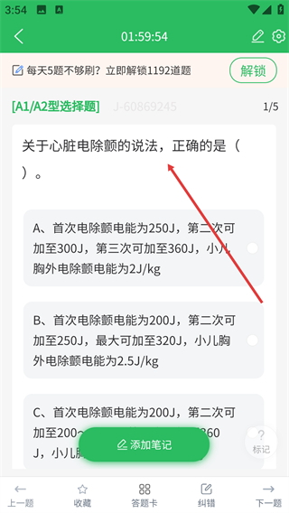 进入练习环节后,页面会呈现【A1/A2型选择题】的题目内容,你可以查看题目以及对应的选项,与此同时,还能运用【添加笔记】之类的辅助功能。