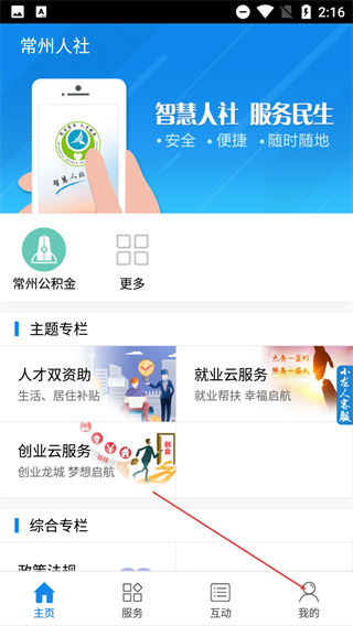 进入【常州人社】首页后,能看到【常州公积】和【主题专栏】等服务板块,点击底部的【我的】选项即可进入相应页面。