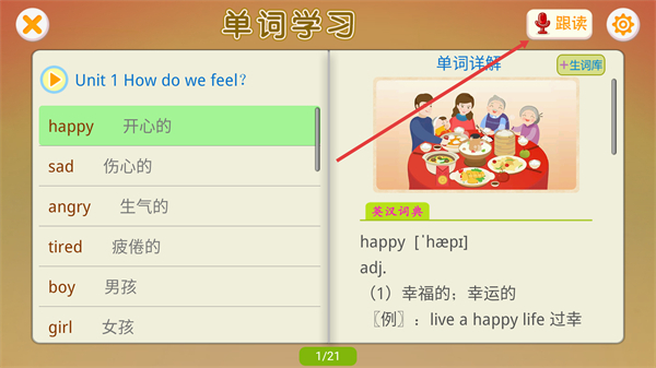 在【单词学习】界面中,点击右上角的【跟读】按钮,就能开启单词跟读练习功能,帮助用户学习单词发音。