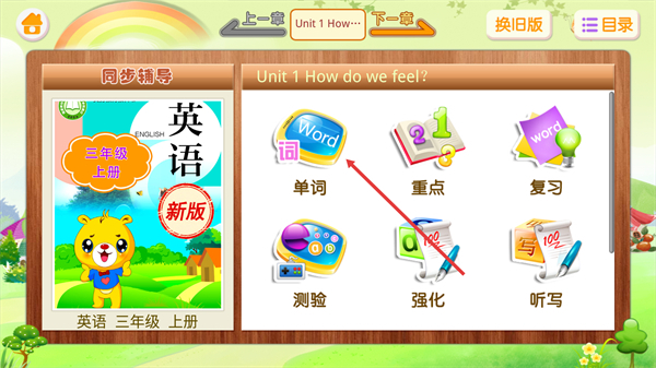 在教材学习页面,找到【Unit-1-How-do-we-feel?】板块下方的【单词】功能按钮,点击该按钮即可进入单词学习模块。