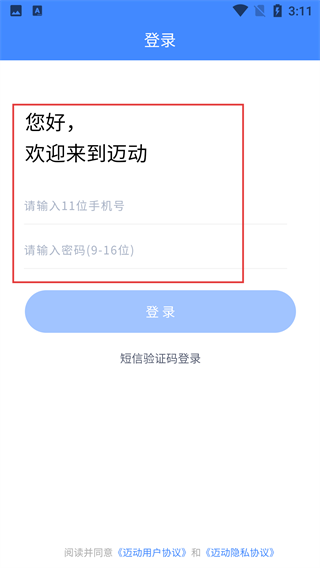 登录页面会显示【您好,欢迎来到迈动】的欢迎语,用户需要填写【请输入11位手机号】和【请输入密码-(9-16位)】这两项信息,此外还能选择通过短信验证码来完成登录。