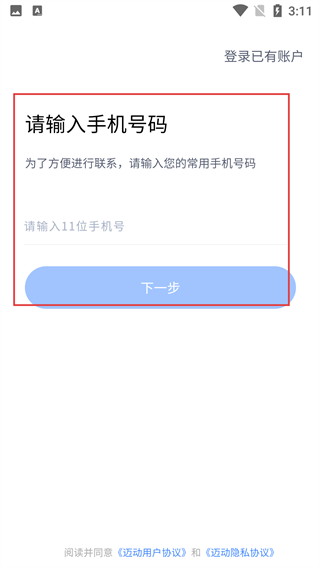 进入【请输入手机号码】页面后,在【请输入11位手机号】的输入框中填写自己的常用手机号码,接着耐心等待验证码发送,收到验证码并填写完成后,点击【下一步】按钮继续推进后续流程。