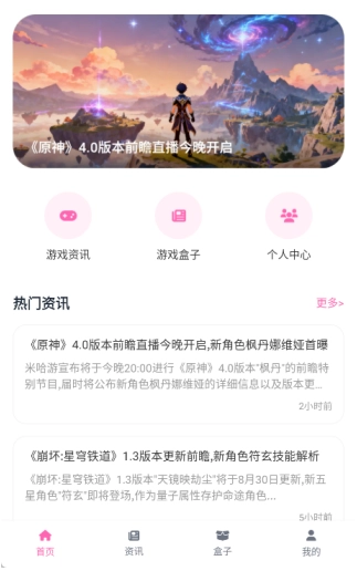 首页设有游戏资讯、游戏盒子板块,用户也可在此了解个人中心的功能。