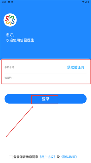 在仔细阅读【信昱医生】的服务协议与隐私政策后,点击【同意并接受】按钮,即可进入应用的后续操作流程。