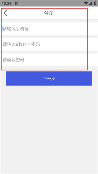 在注册界面,请按顺序填写【请输入手机号】、【请输入6位及以上密码】、【请确认密码】这三项内容;待所有信息填写完毕后,点击【下一步】按钮即可。