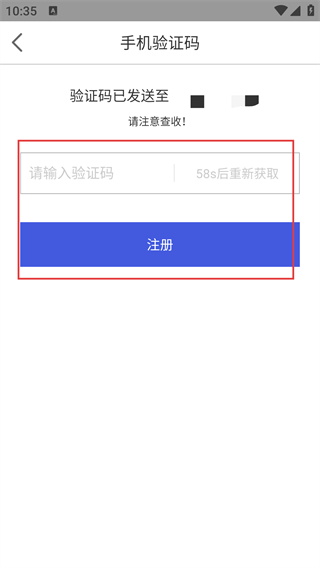 进入手机验证码页面后,在“请输入验证码”的输入框中填写你收到的验证码,接着点击“注册”按钮,这样就能完成账号注册了。