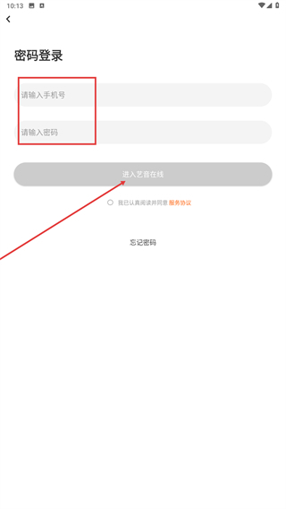 也可以选择密码登录的方式,填写手机号和密码,勾选相关协议后点击【进入艺音在线】按钮,即可完成登录。