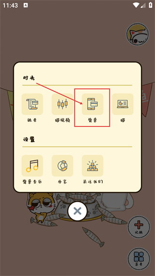 打开菜单界面后,在“时光”板块可以找到【背景】选项,此外还能使用账单、喵视频等功能,以及设置板块的相关选项。