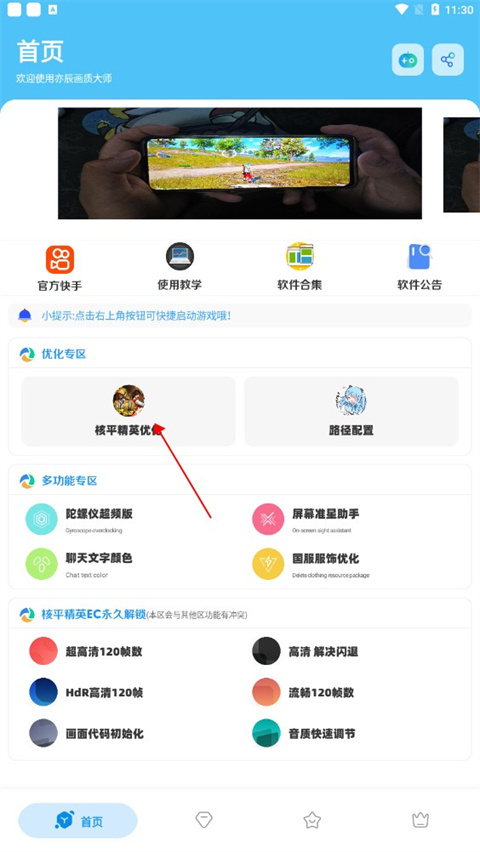 3、在这里我们能看到多功能专区,接着点击和平精英优化。