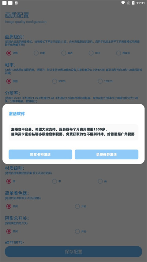 5、配置完成并保存后,系统会提示你需要先激活软件,此时有两个选项可供选择:购买卡密激活与免任务激活,你挑选其中一个即可。激活成功后就能打开游戏,尽情体验高清画质带来的游戏乐趣了!