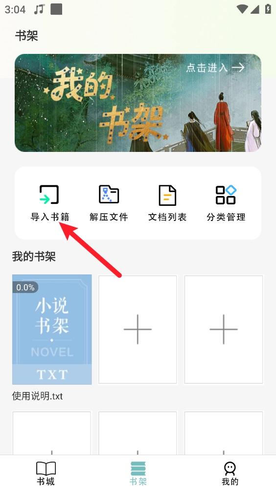 5、回到主页后进入书架板块,还能依据自身需求导入书籍。