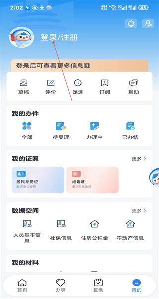 打开渝快办应用,进入首页后,能看到各类服务选项,接着点击页面底部的“我的”选项,即可进入个人中心页面。