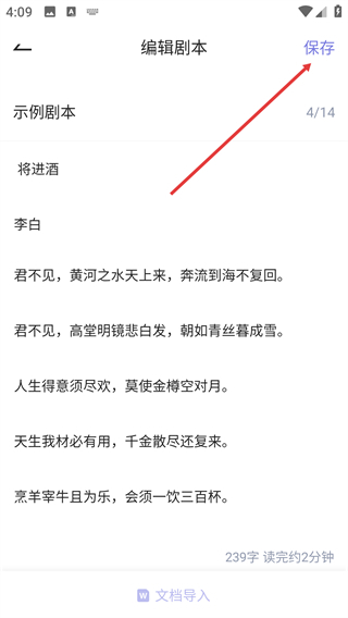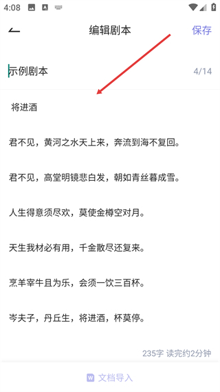 进入【编辑剧本】页面后,你可以对剧本的文本、标题等内容进行修改和调整,还能借助【文档导入】功能来补充相关内容。