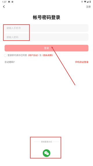 进入【账号密码登录】页面后,你可以填写【手机号】和【密码】,然后点击【登录】按钮;此外,还能选择【微信】等其他登录方式。