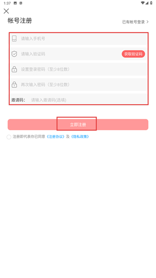 在【账号注册】页面,按顺序填写【手机号】【验证码】【登录密码】等信息,勾选相关协议后点击【立即注册】按钮,即可完成注册流程。
