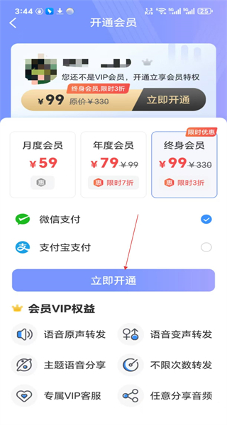 登录系统后,进入会员开通界面,挑选终身会员的套餐选项,确定使用微信支付的方式,然后点击“立即开通”按钮完成支付流程。