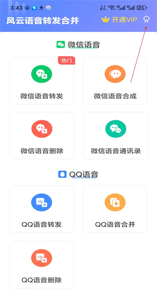 打开软件后,进入主界面,能看到微信语音和QQ语音相关功能,点击界面右上角的图标按钮,即可进入个人中心页面。