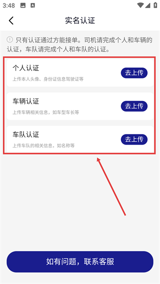 进入【实名认证】页面后,可根据实际需求选择【个人认证】、【车辆认证】或【车队认证】,随后点击对应认证选项旁的【去上传】按钮提交相关资料即可。