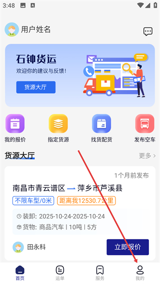 进入【石钟货运】首页后,点击底部导航栏中的【我的】选项,即可进入个人相关功能页面。
