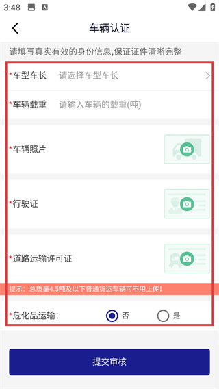 进入【车辆认证】页面,填写【车型车长】-【车辆载重】等相关信息,上传所需证件后点击【提交审核】,即可完成操作。
