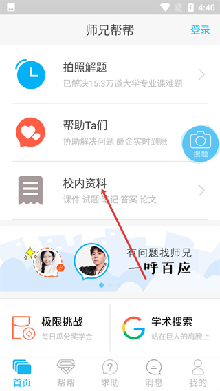 在【师兄帮帮】首页点击【校内资料】选项,就能进入资料搜索页面,这个功能可以查找课件、试题等校内资源。