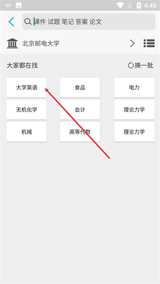 在资料搜索页面的【大家都在找】板块,点击你想要的学科标签(比如【大学英语】),就能迅速筛选出该学科相关的资料。