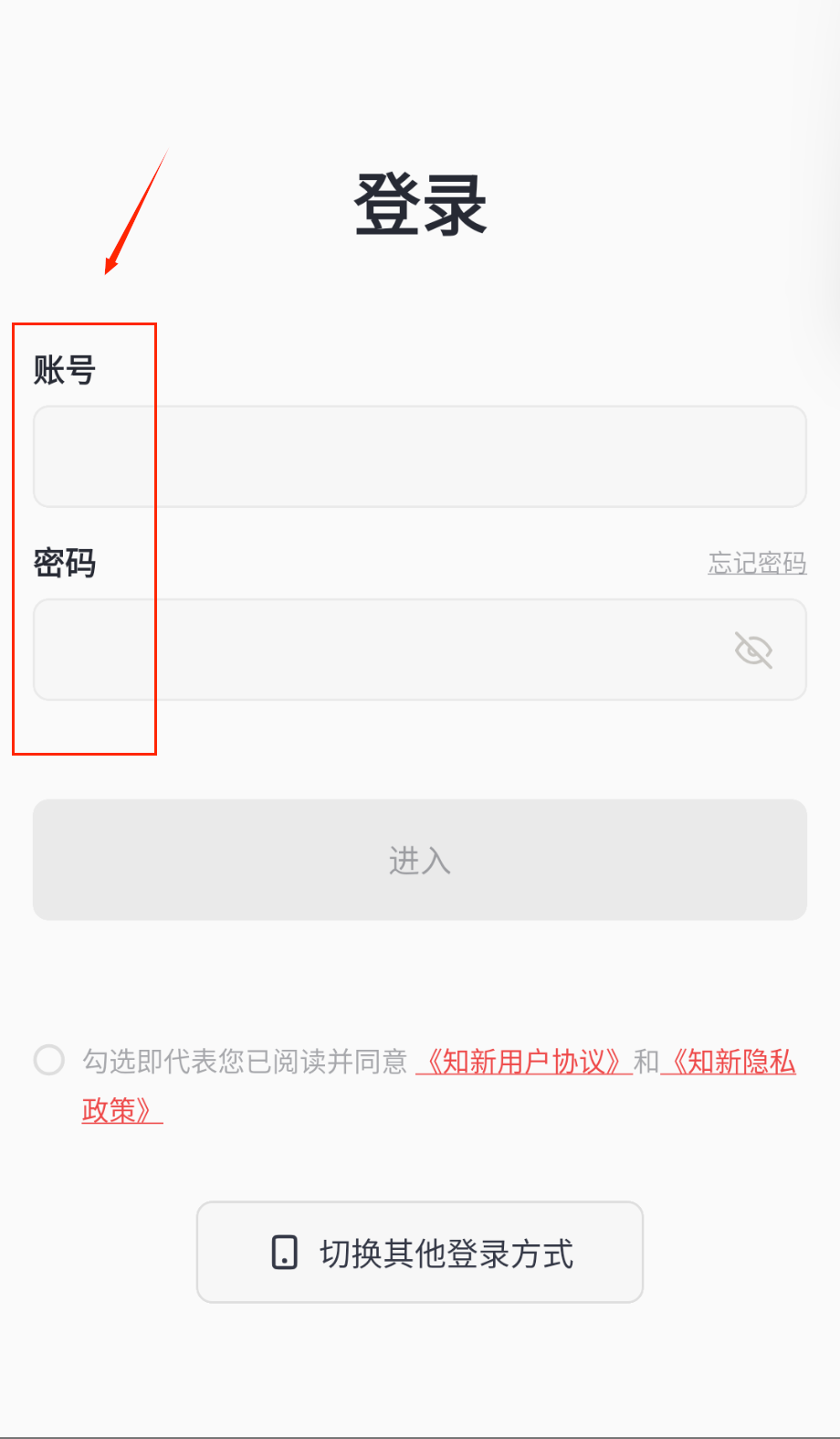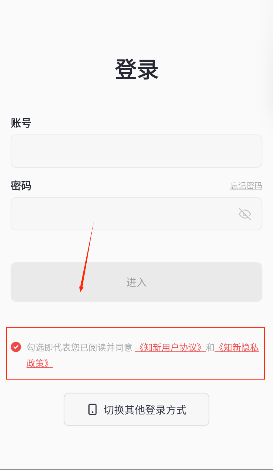 输入账号密码后,记得勾选页面最下方的用户协议复选框——这个选项是登录的必要条件,必须同意才能继续操作,协议名称用醒目的红色字体标注着。