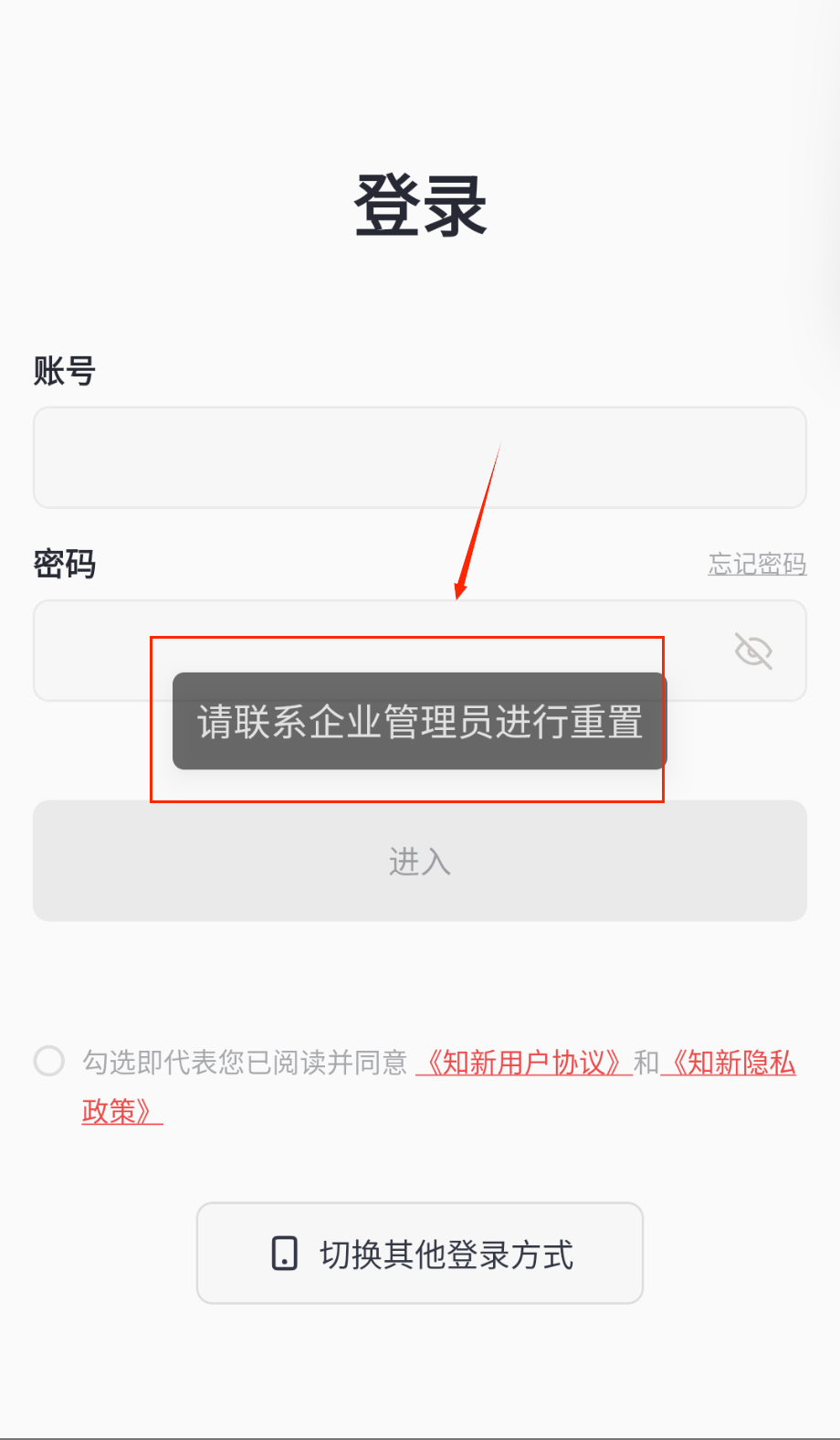 若不慎遗忘密码,可点击密码输入框右侧的“忘记密码”链接,系统将指引你联系企业管理员完成密码重置,重置完成后即可使用新密码登录系统。