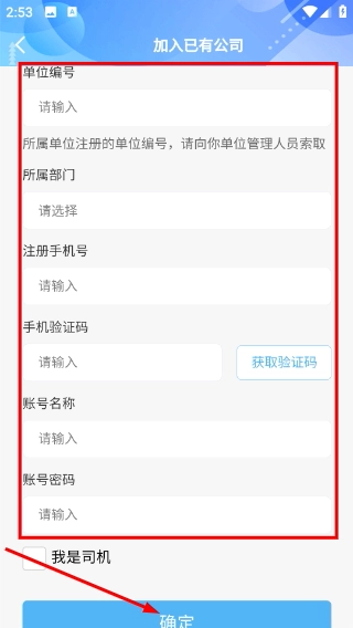 2、填写单位编号、所属部门、注册手机号等信息,获取并填写验证码,设置账号名称和密码后,点击【确定】即可申请加入对应单位。