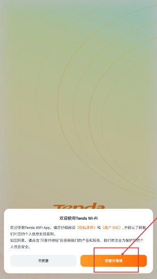 1、阅读TendaWiFiApp的服务协议后,点击【同意并继续】按钮,完成协议确认以进入应用主界面。