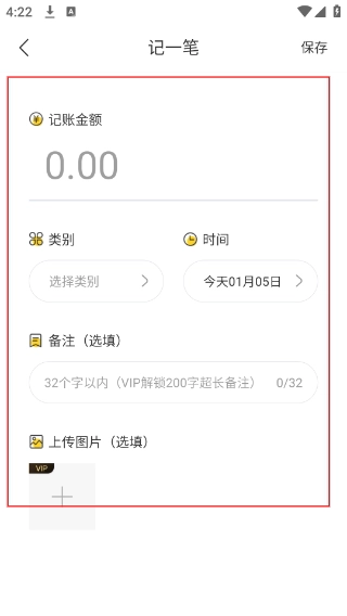 2、进入【记一笔】页面后,要填写【记账金额】,选择【类别】和【时间】,另外还能补充【备注(选填)】或者上传图片。
