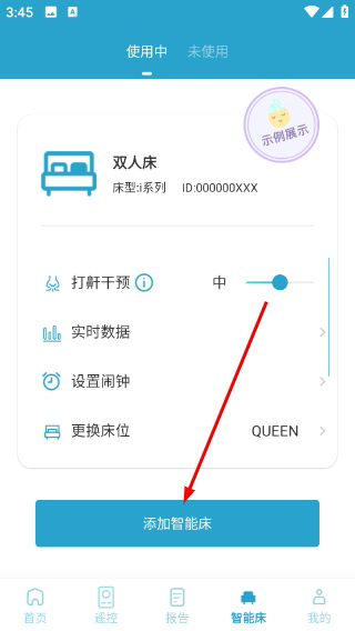 2、在智能床页面点击【添加智能床】按钮,即可进入遥控器配对环节。