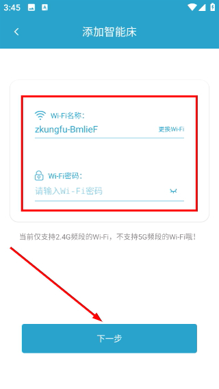 4、进入智能床的WiFi配置页面后,先核对WiFi名称是否正确,再输入该WiFi对应的密码(注意仅支持2.4G频段),最后点击【下一步】按钮,即可完成智能床的网络绑定操作。