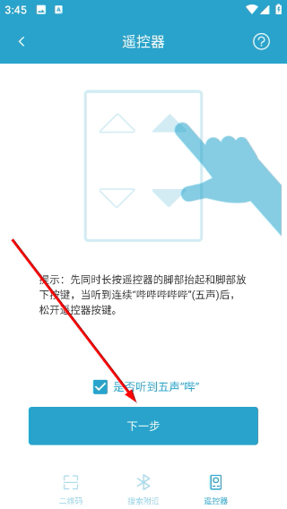 3、依据提示操作遥控器,待确认听到提示音后,点击【下一步】。