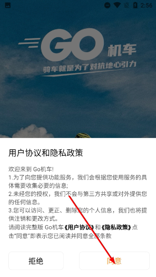 1、进入【GO机车】界面后,需要阅读【用户协议和隐私政策】,在了解信息收集规则后点击【同意】按钮以继续操作。