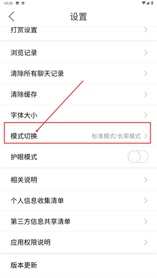 进入设置页面后,找到【模式切换】这一选项,点击它就能进入界面显示模式的选择界面。