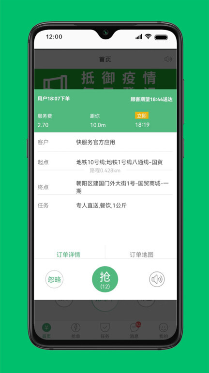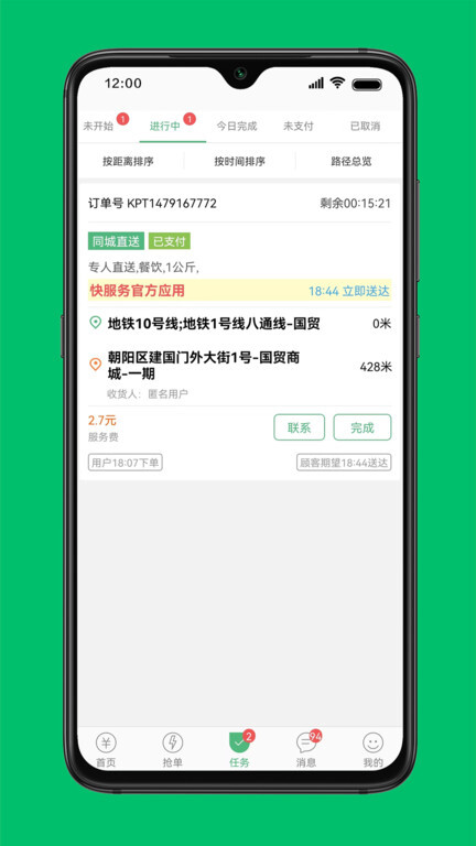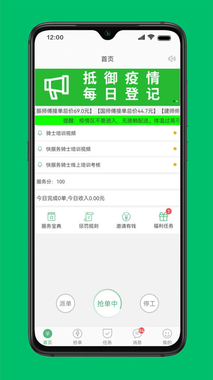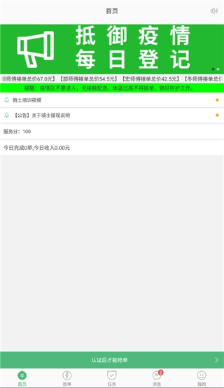 完成认证后进入首页和抢单板块,即可开始接单。