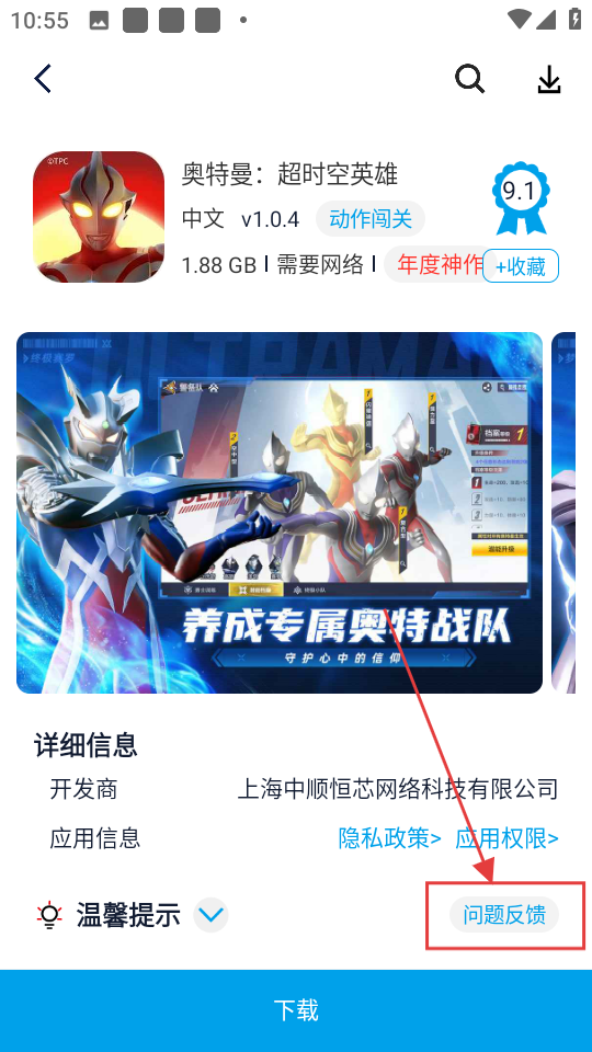 2、进入游戏详情页后,点击【问题反馈】选项,即可进入反馈页面。