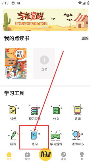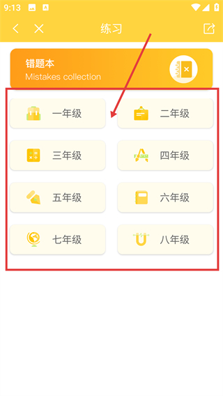 1、在首页的学习工具区域,点击【练习】选项后,即可进入练习功能的年级选择界面。