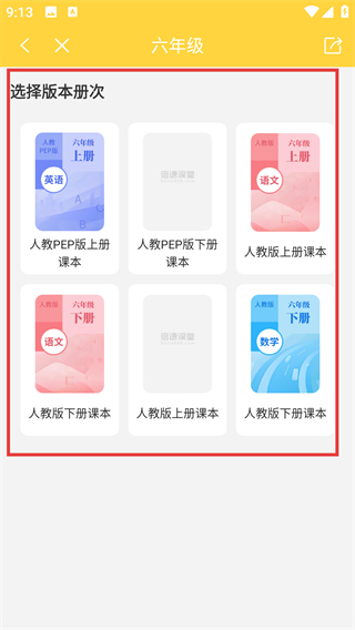 2、进入练习页面后,选择对应的年级(例如六年级),即可进入该年级的版本册次选择界面。