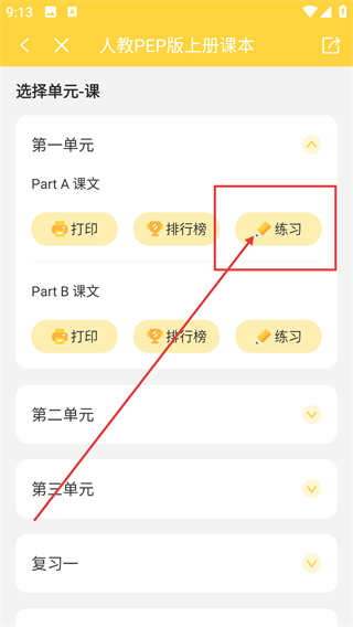 4、进入单元-课页面后,点击对应课文旁边的【练习】按钮,即可开启该内容的练习任务。
