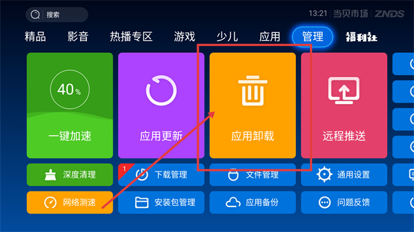 2、在管理页面找到【应用卸载】功能并点击,即可进入应用卸载操作界面,为清理不需要的应用做好准备。