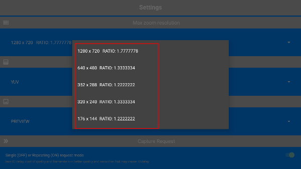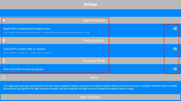 4、进入“Settings”页面后,能够对【CaptureRequest】【SurfacesCache】等功能选项进行开启或关闭的设置操作,以此来调整应用的相关参数。