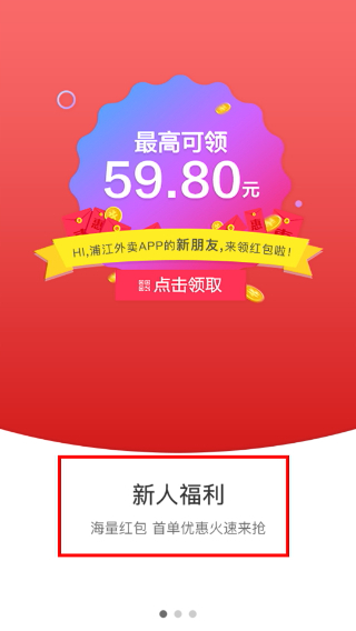1、这是浙江外卖的新人引导页面,在这里可以领取最高59.80元的新人红包,还能参与“新人福利”板块里的海星红包、首单优惠等各类活动。