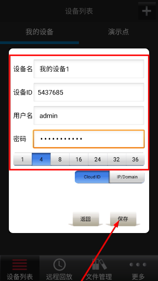 2、在设备信息填写界面,依次输入【设备名】-【设备ID】-【用户名】-【密码】后,点击对应按钮,即可保存设备信息。