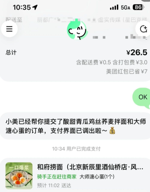 小美能依据你过往的订单记录与地址库信息,自动辨认你的偏好和常用地址,进而迅速完成点单和配送流程。