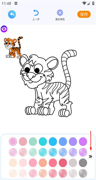 进入填色界面后,找到颜色选择面板,点击面板右侧的箭头,就能显示更多可供选择的颜色。