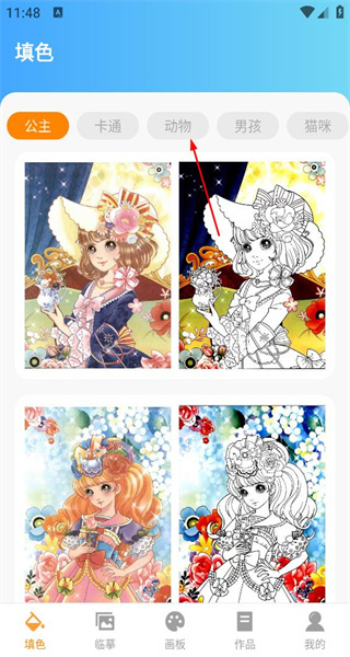 启动软件后,浏览各类分类标签,找到并选择动物分类,随后进入该分类对应的图案展示页面。