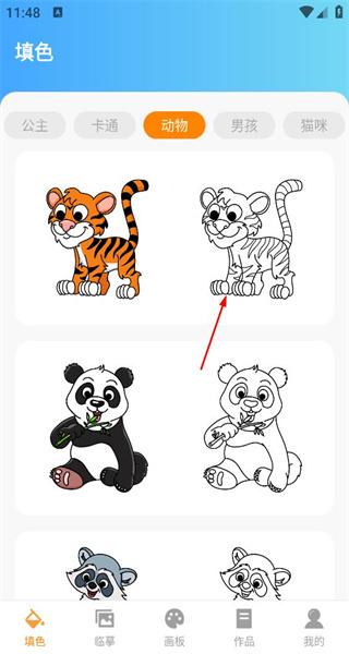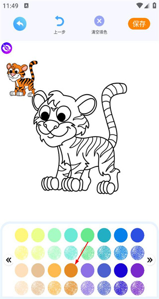 在动物图案页面,选择老虎图案,点击该图案,进入老虎图案的填色编辑界面。